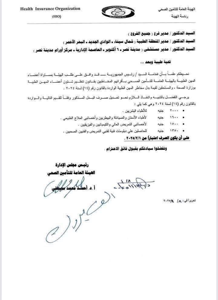 1600 جنيه مرة واحدة.. زيادة بدل المخاطر الطبية بهيئة التأمين الصحي
