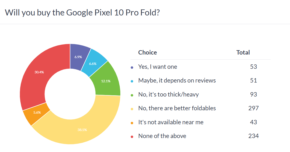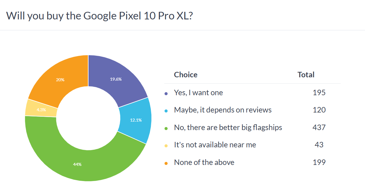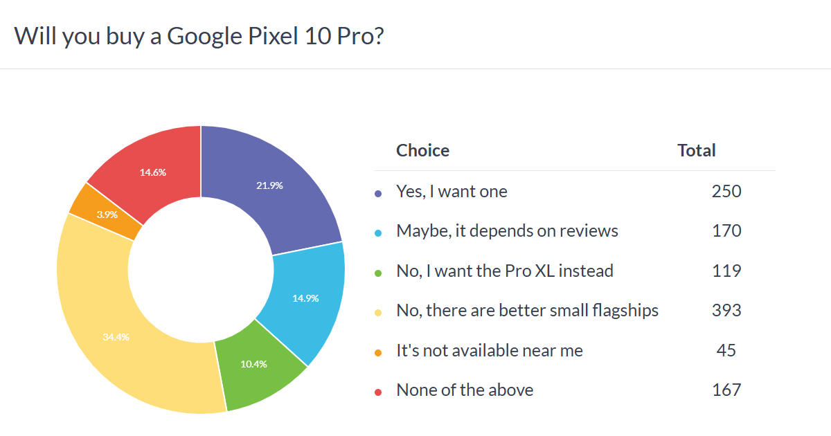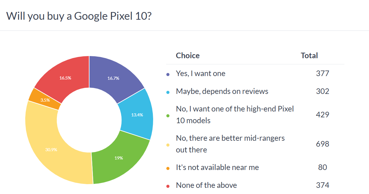 أظهرت نتائج الاستطلاع الأسبوعي أن نماذج بيكسل 10 الأربعة ستسير في مسارات مختلفة، وليس جميعها تشير نحو النجاح، على الرغم من أن جوجل لم تقم برفع الأسعار مقارنة بسلسلة 9، إلا أن الكثير من الناس يجدون صعوبة في تبرير التكلفة، يبدو أن الأسعار تمثل مصدر قلق كبير للمستخدمين، حيث يتساءل الكثيرون عما إذا كانت الميزات الجديدة تستحق الزيادة المحتملة في السعر.