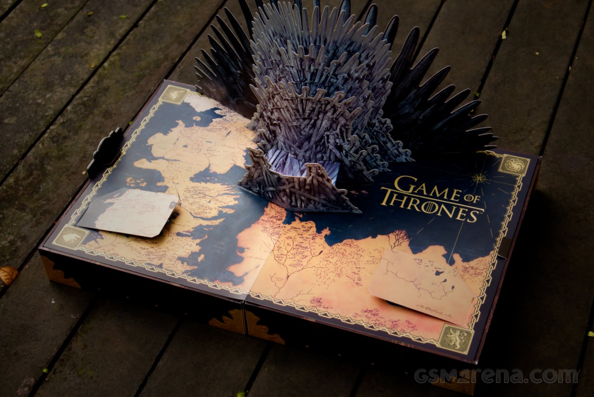 يأتي الهاتف في عبوة أنيقة من الكرتون تحمل شعار Game of Thrones، وداخلها صندوق مصنوع من الخشب يفتح بشكل جانبي، ويظهر من خلاله عيون التنين تتداخل مع صورة العرش الحديدي، وهو نفس الملصق المستخدم في الموسم الأخير من المسلسل، عند فتح الصندوق، يظهر تمثال صغير للعرش الحديدي يعمل كحامل للهاتف، بالإضافة إلى لفافة تحتوي على نص سري يظهر فقط تحت أشعة الشمس، وشاحن وكابل أسود، وغطاء سيليكون مخصص، وملصقات وبطاقات بريدية تحمل صور الشخصيات الرئيسية.