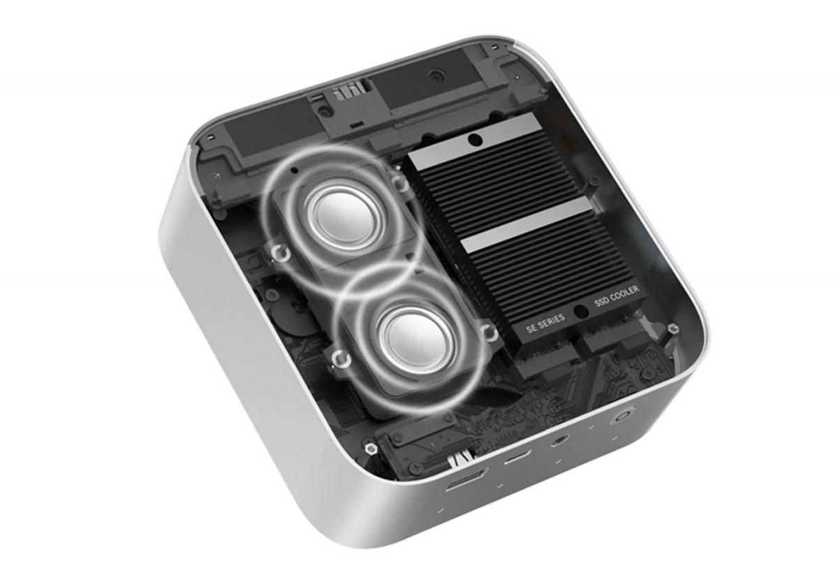 يوجد داخل الجهاز مكان لتركيب قرص SSD ثاني وواي فاي، مع فتحتين M.2. يمكن أيضًا استخدام قاعدة Mate SE الاختيارية التي تكلف 139 دولارًا، والتي تضيف منافذ إضافية، وتدفق بيانات عالي يصل إلى 80 جيجابت في الثانية، مع منفذ Ethernet بسرعة 2.5G، ومنفذي USB-A 3.0، ومنفذين USB-C، بالإضافة إلى فتحة بطاقة SD 4.0.