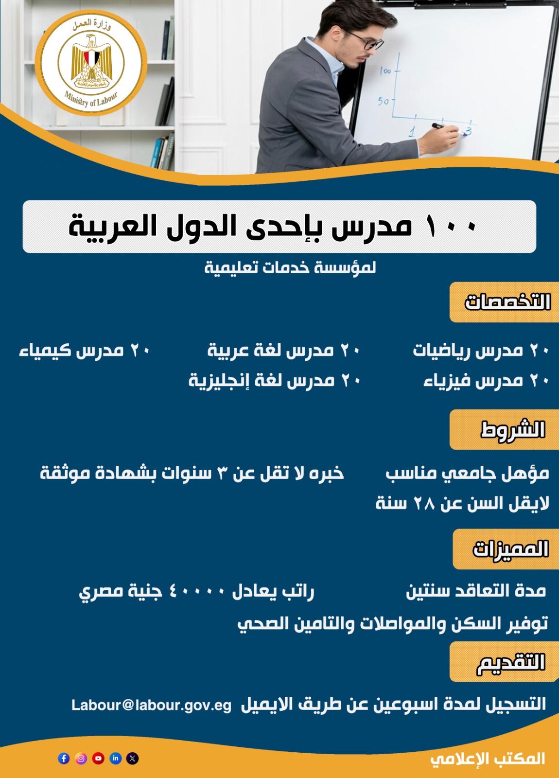 أعلن محمد جبران وزير العمل، عن توفير 100 فرصة عمل على وظائف مختلفة بمؤسسة خدمات تعليمية بإحدى الدول العربية، وذلك بمرتب شهري يعادل 40 ألف جنيه مصري.