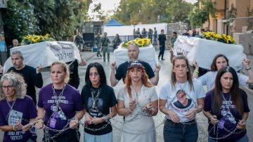 إيناف زانغاوكير تحمل زجاجة بول ابنها من غزة خلال احتجاج على أسر الجنود